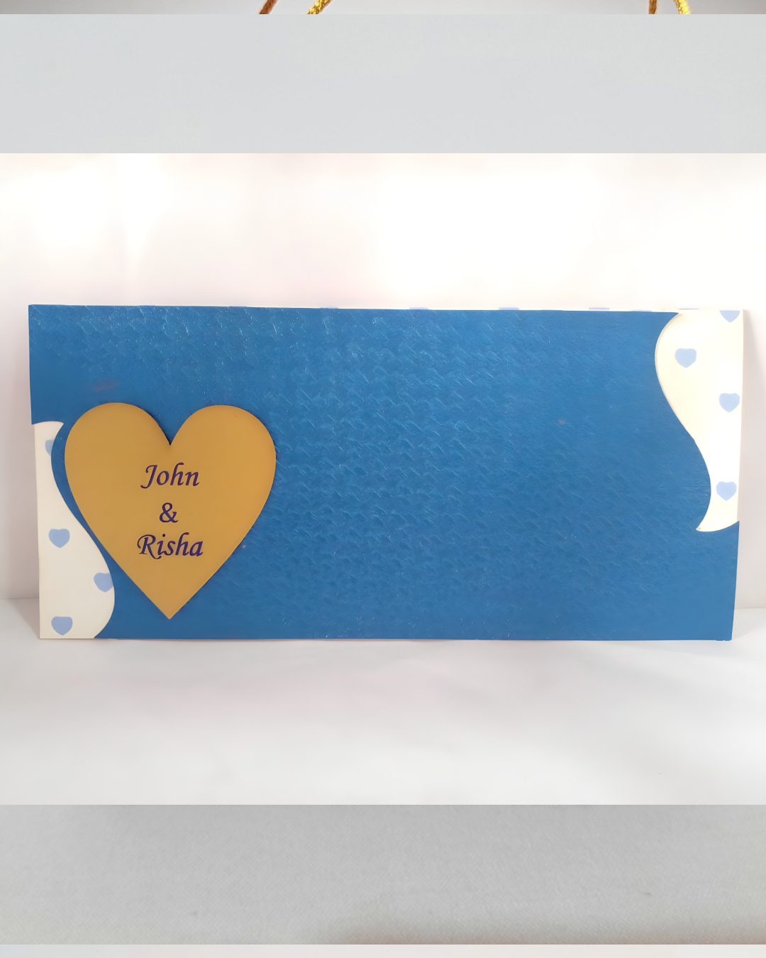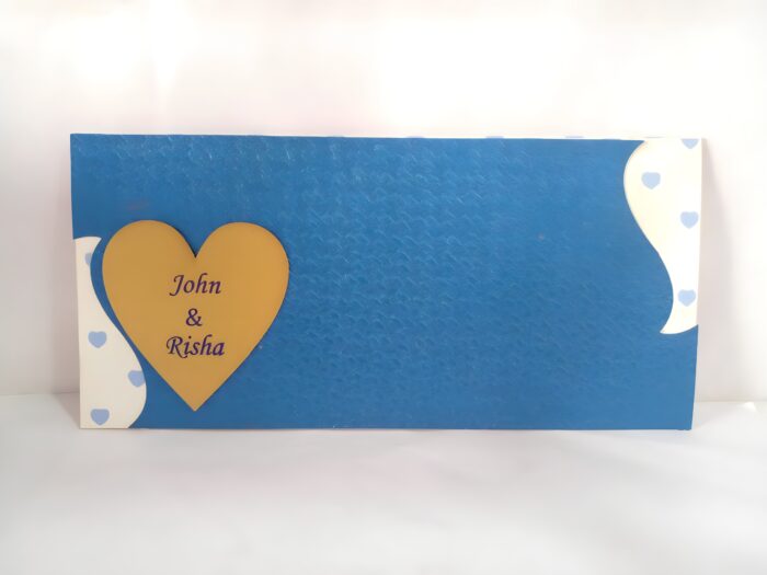 Blue Heart wedding invitation is one of our elegant design. This invitation card is made out of White and Blue textured paperboard with matching mailing envelope. Card has a watermark design. (Please note, this logo can be changed to any symbol or couple initial as per your preference). Please choose one of the colours from our colour pallet (please check the image) for envelopes. 120gsm shimmer paper. The card has inserts pasted in the middle of the card with coordinated printed design.