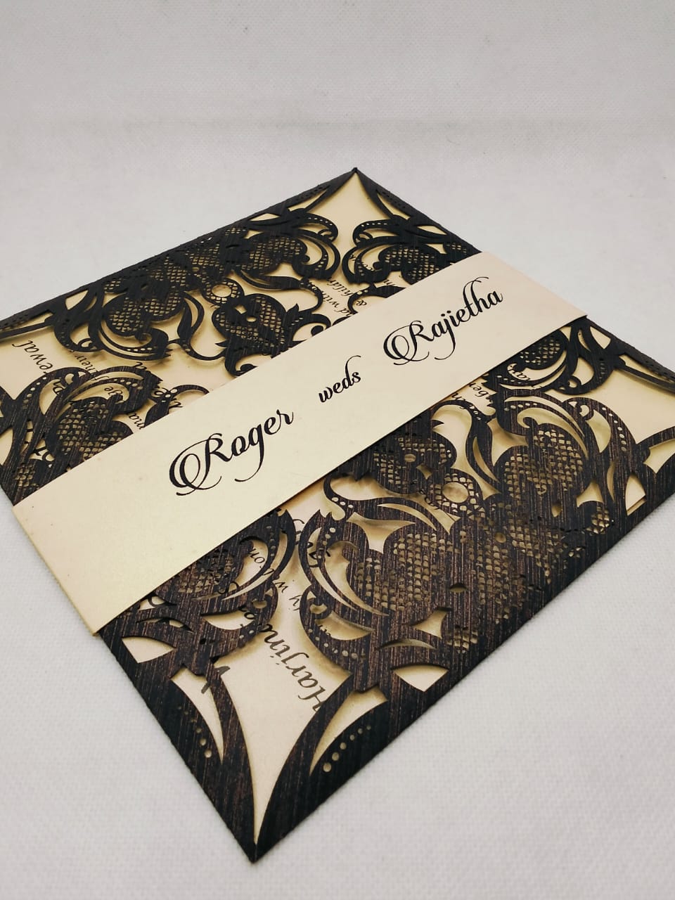 We create grand scrolls, breath-taking custom laser cuts, divine wood finishing, step cuts, threaded invites, you name we got them all. The finest silk, satin, and wood textures use to create stylish modern invitations. finishing is our specialty. All stones are stuck on by hand with perfect finishing.